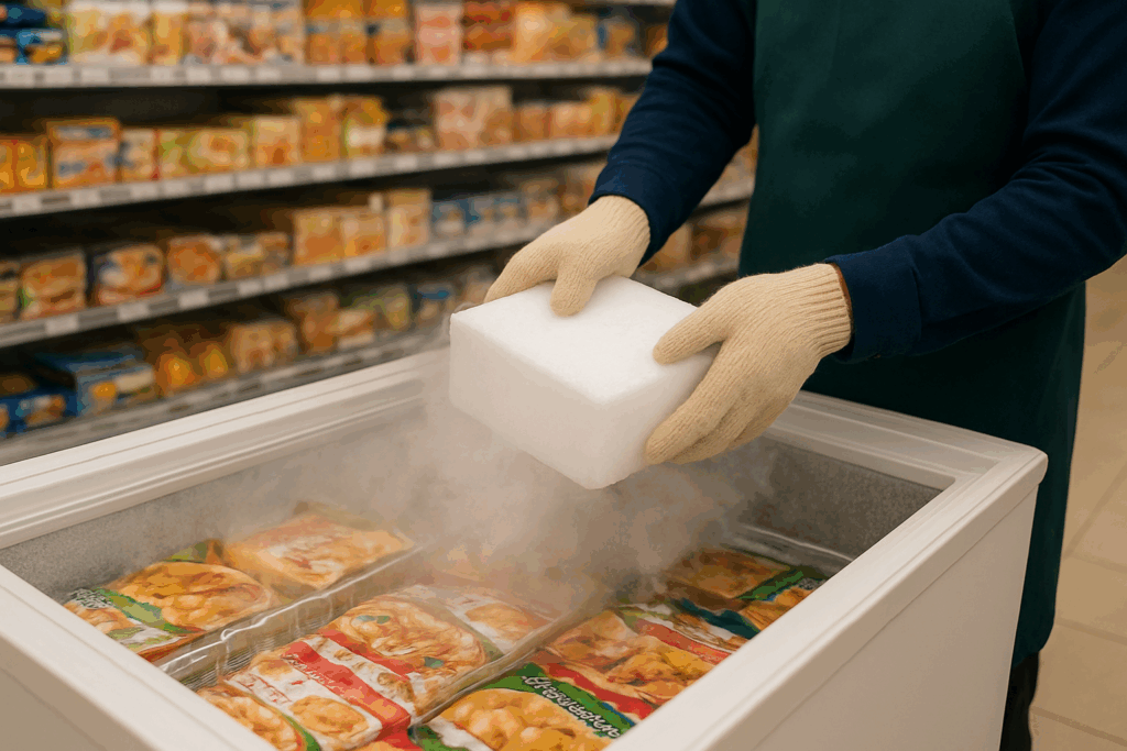 冷凍食品、アイス、精肉、惣菜など、温度管理が必要な商品が溶けてしまえば、廃棄ロスや衛生面でのリスクが発生します。そんな時、頼りになるのが「ドライアイス」です。