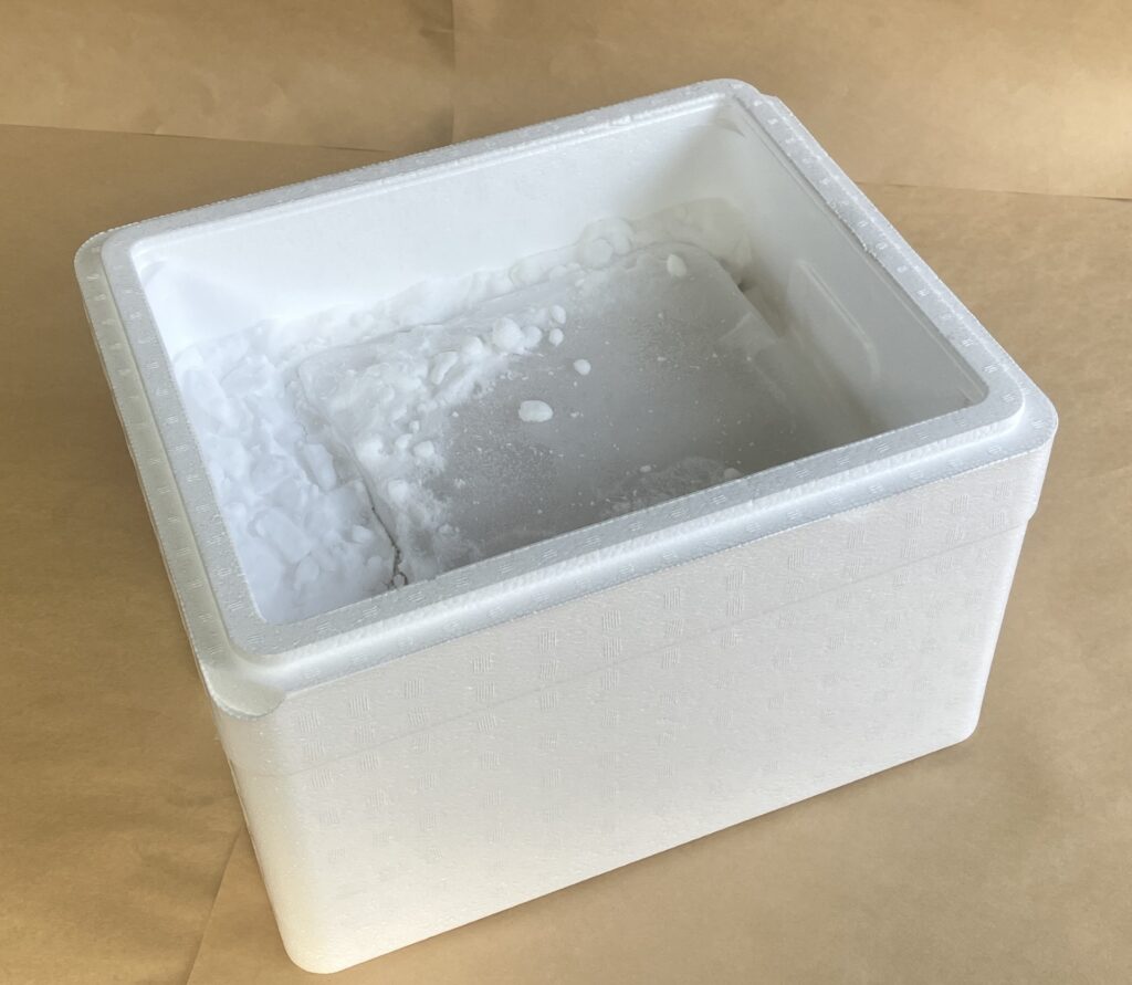 最後に、ドライアイスを発泡スチロール箱に入れて梱包します。