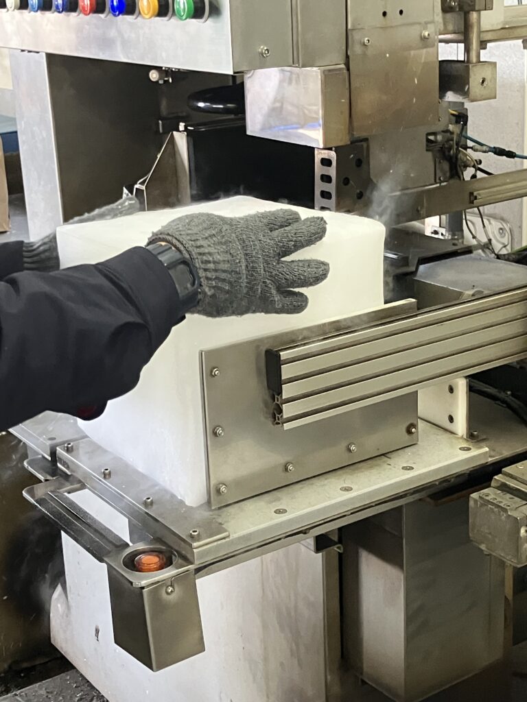 カットしたばかりのドライアイスは非常に低温のため、専用の手袋を着用し、安全に注意して作業しています。