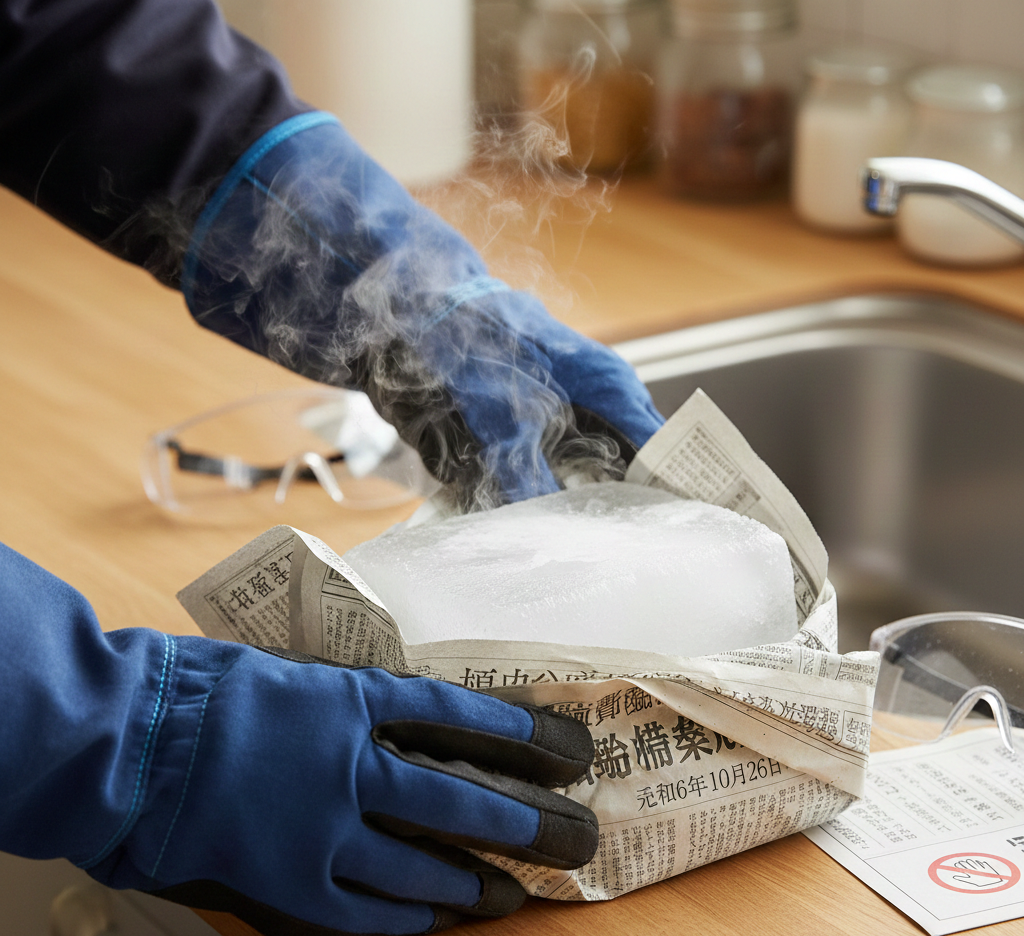 ドライアイスは超低温のため、素手で触ると凍傷の危険があります。